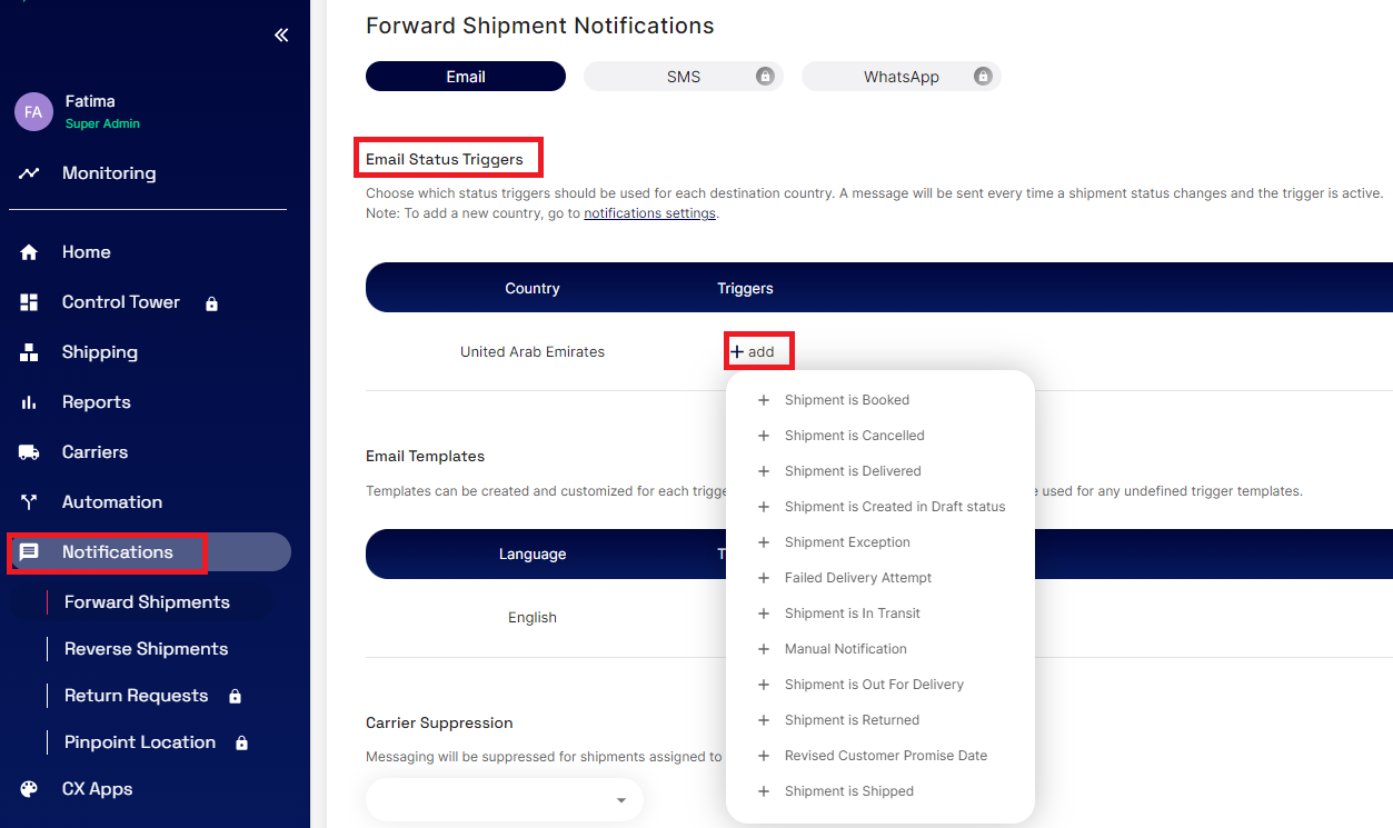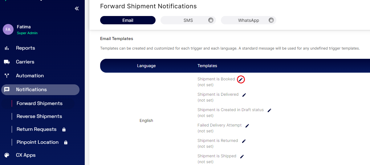 Now, we've added default templates for all status triggers. Users can utilize or customize these templates for the statuses they enable. Once enabled, and statuses triggered, these notifications will be sent to the end customers.