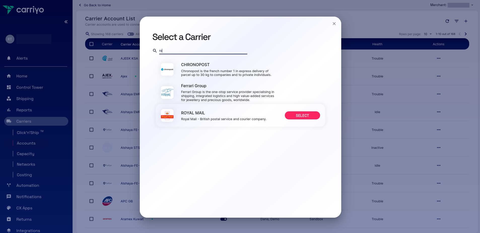 1. Navigate to Carriers > Accounts on the Carriyo Dashboard. The page displays a list of all carrier accounts that have been previously created. To create a new Royal Mail carrier account, click on the add icon on the top right corner. Click on Select to proceed with the creation.