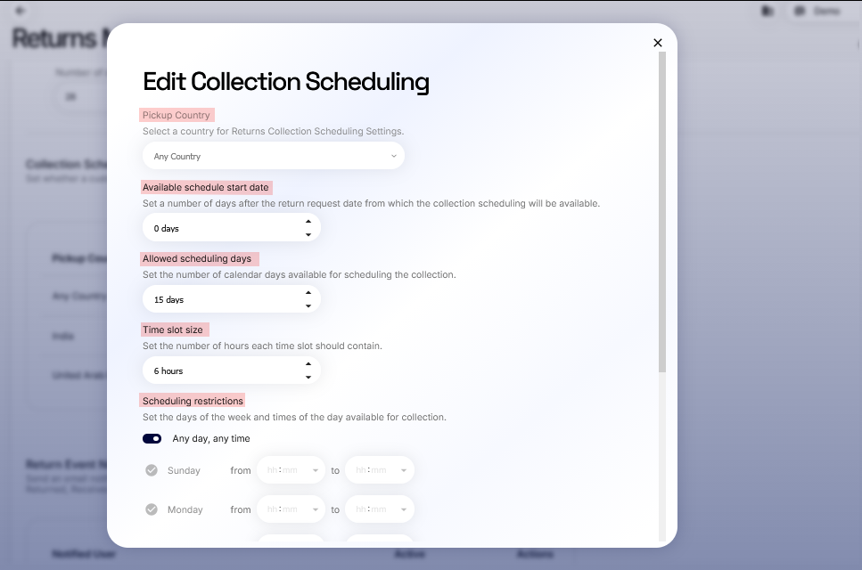 Scheduling restrictions - Defines the days of the week and times of the day available for collection. Disable the Any day, any time toggle to input timings for individual days.