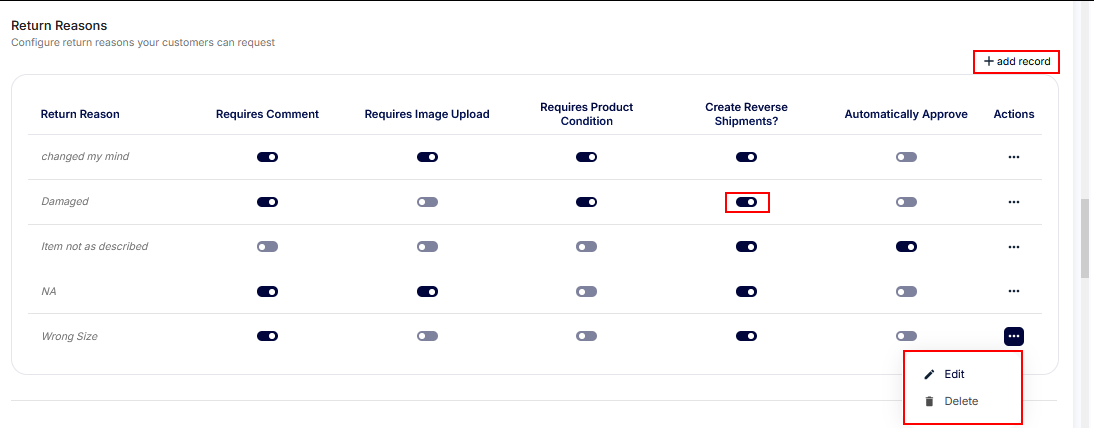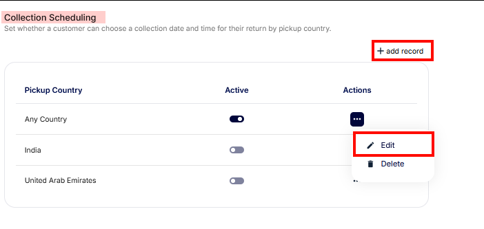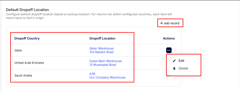 If configured, it will set the default dropoff location for the return request based on the pickup location. For returns not within configured countries, each item will return back to item's origin. To add a new entry, click on + add record. Each entry can be edited or deleted.