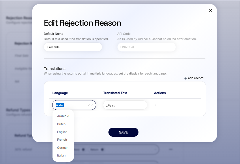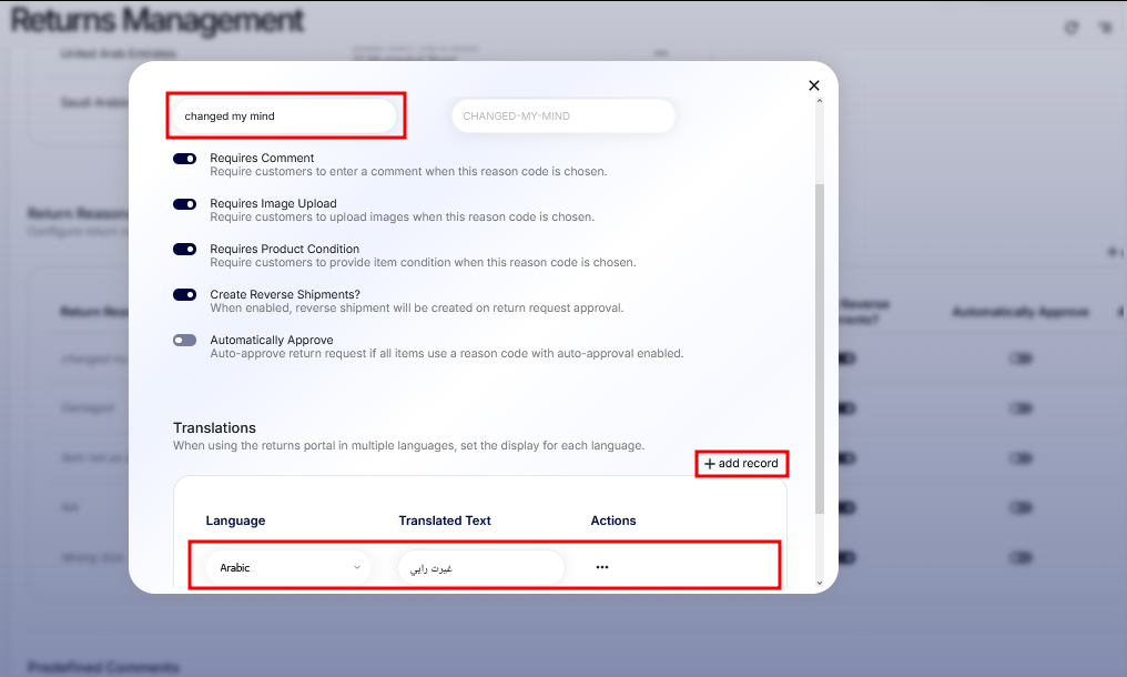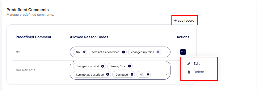 This section allows you to specify predefined comments associated with reason codes that customers can choose while submitting the return request.