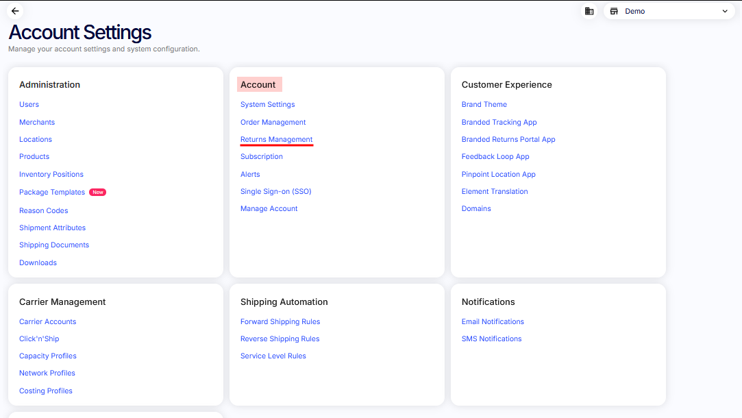 1. Navigate to Settings > Account > Returns Management on the Carriyo Dashboard. Select the merchant for which you need to configure the settings. All the sections in the page are explained below.