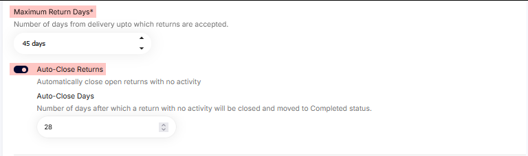 Auto-Close Returns - When this toggle is enabled, a return request will automatically close after the number of days specified in Auto-Close Days, if no activity has been recorded. The return request will then be closed and moved to Completed status.
