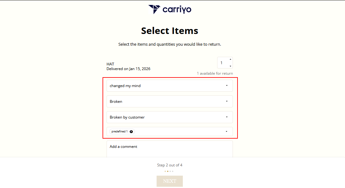 Allow predefined comments - Brands can configure pre-defined comments in Carriyo for customers to choose from while selecting the required items to return. Enabling this toggle facilitates this feature.