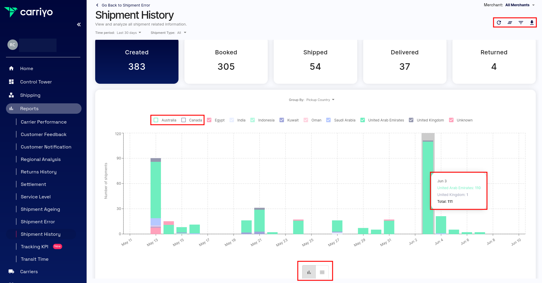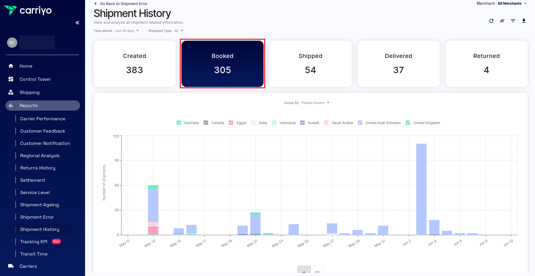 1. Navigate to Reports > Shipment History on the Carriyo Dashboard. The page displays, by default, both types of shipments within a period of 30 days in the form of a bar/column chart.