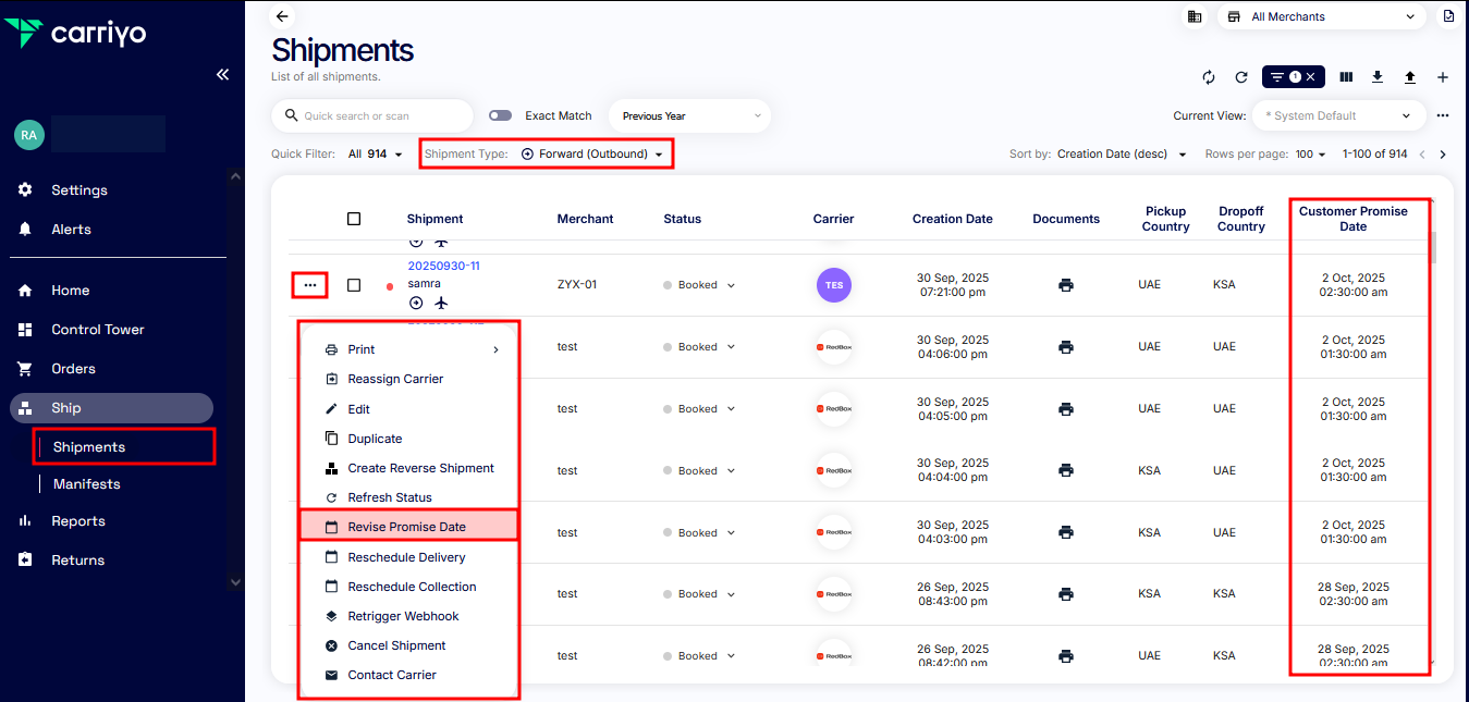 1. Navigate to Shipping > Shipments on the Carriyo Dashboard. Select the desired Forward or Reverse shipment. There are two ways to revise the promise date of a shipment. One is done from the page itself and the other is done inside a specific shipment's Shipment Detail page as shown below. See how to update the Promise Date via API here.