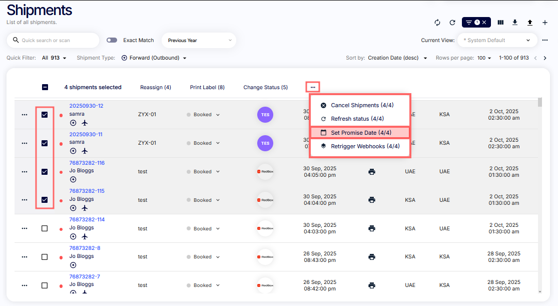 4. For revising promise dates in bulk, select the required shipments (to select all, check the box in the table header), and click on more options and choose Set Promise Date from the list of actions.