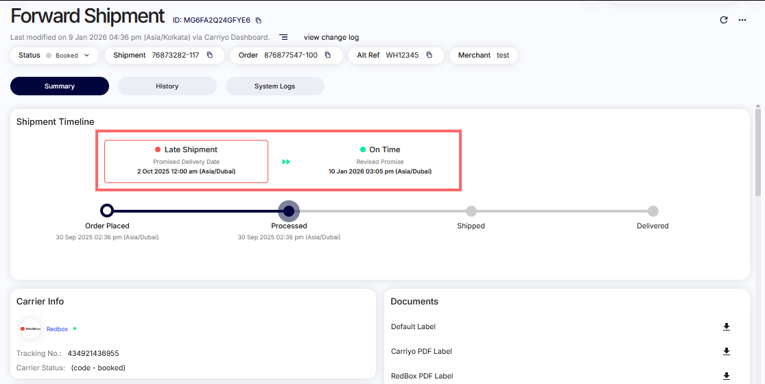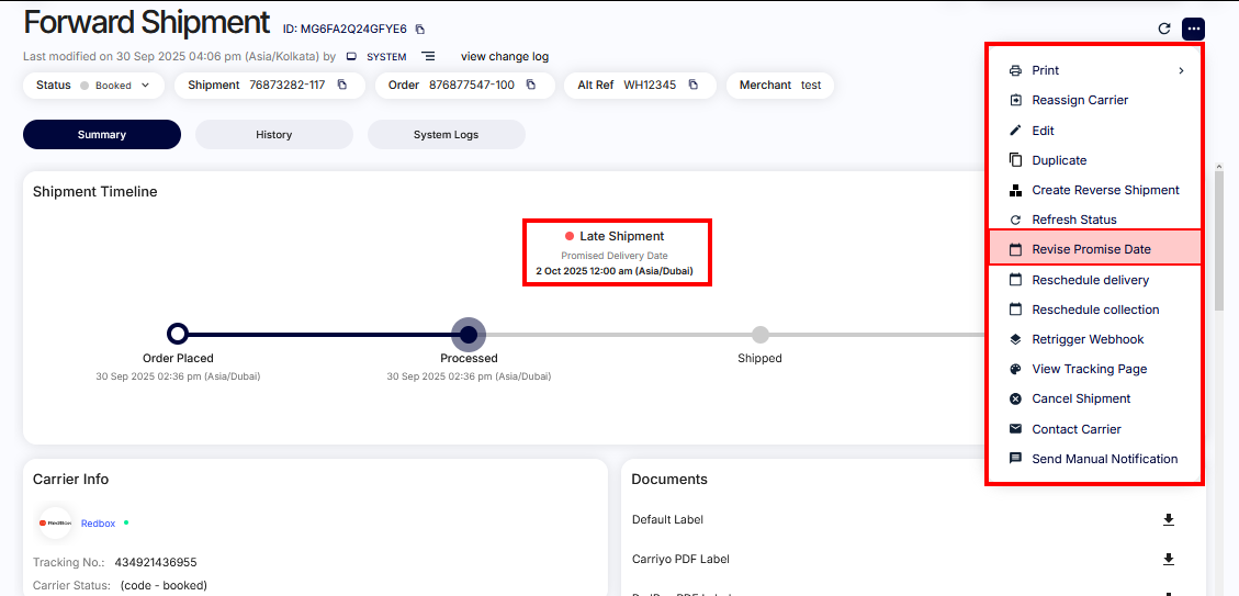 3. Once the above operation has been successfully completed, the original and the Revised Promise Date will be visible on the Shipment Detail page.