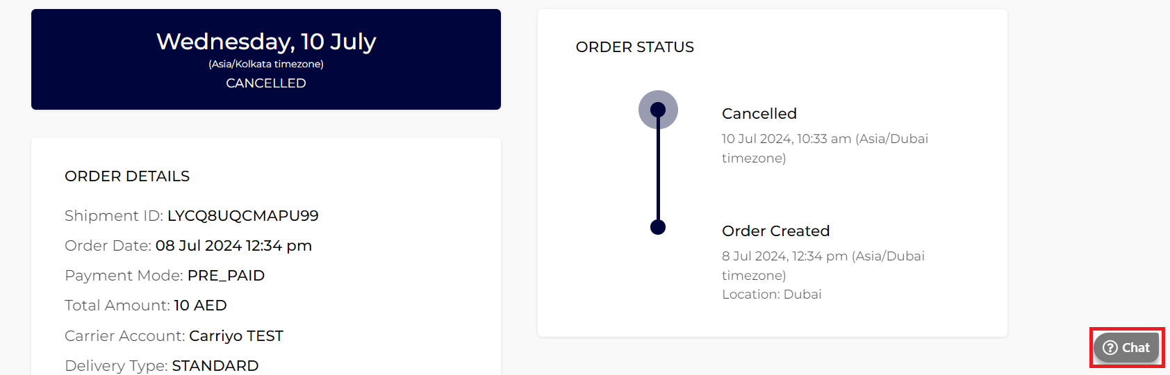After setting up the integration, you'll see a 'Chat' pop-up at the bottom of the tracking page. This allows your clients to communicate directly with your customer service team.