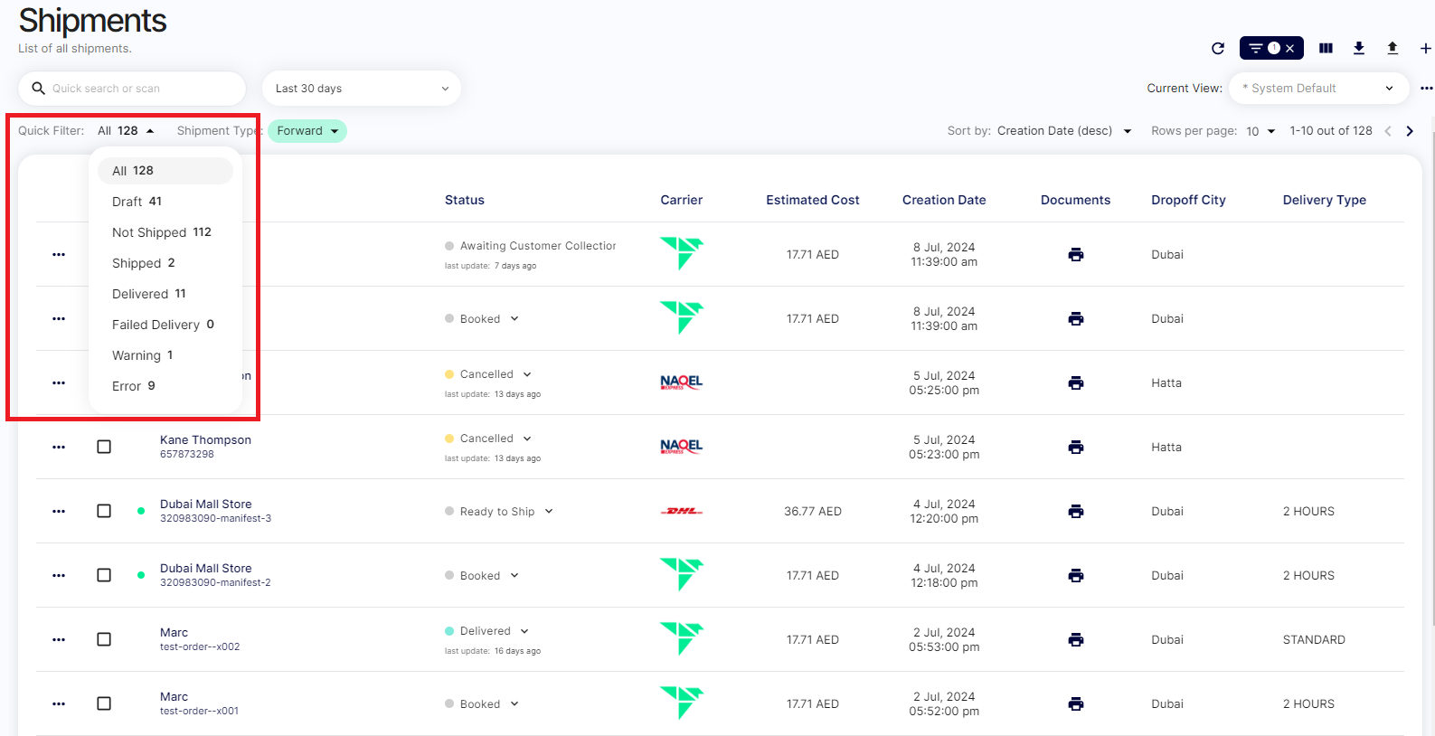 Quick filter update: to maximize the number of shipments displayed, we removed the quick filter from the top. The quick filter statuses, previously listed in a line, are now accessible through a dropdown. Click on "All" to see different statuses along with the quantity of shipments in each status.