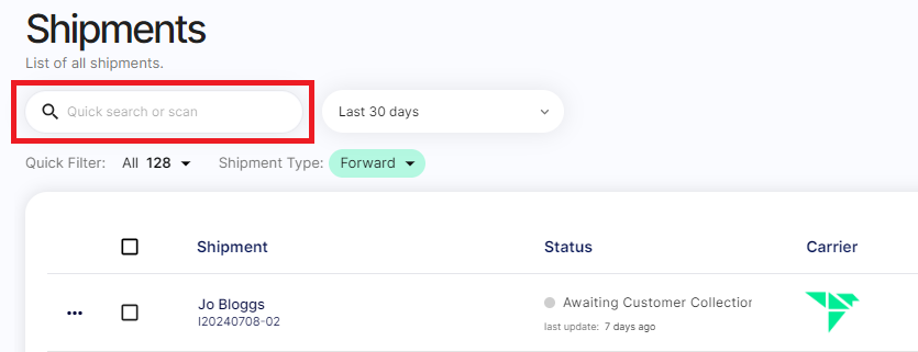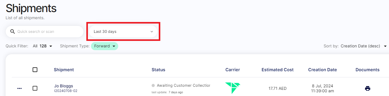 Improved search performance by displaying only the most recent shipments (from the last 30 days). Older shipments can be accessed by selecting the history from the dropdown menu under "Last 30 days."