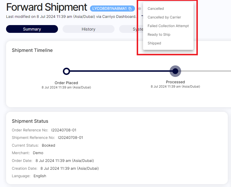 To update a shipment, simply go to the dashboard, edit your shipment, and change it to the desired status. Please ensure you have confirmation before making any modifications to the shipment status.