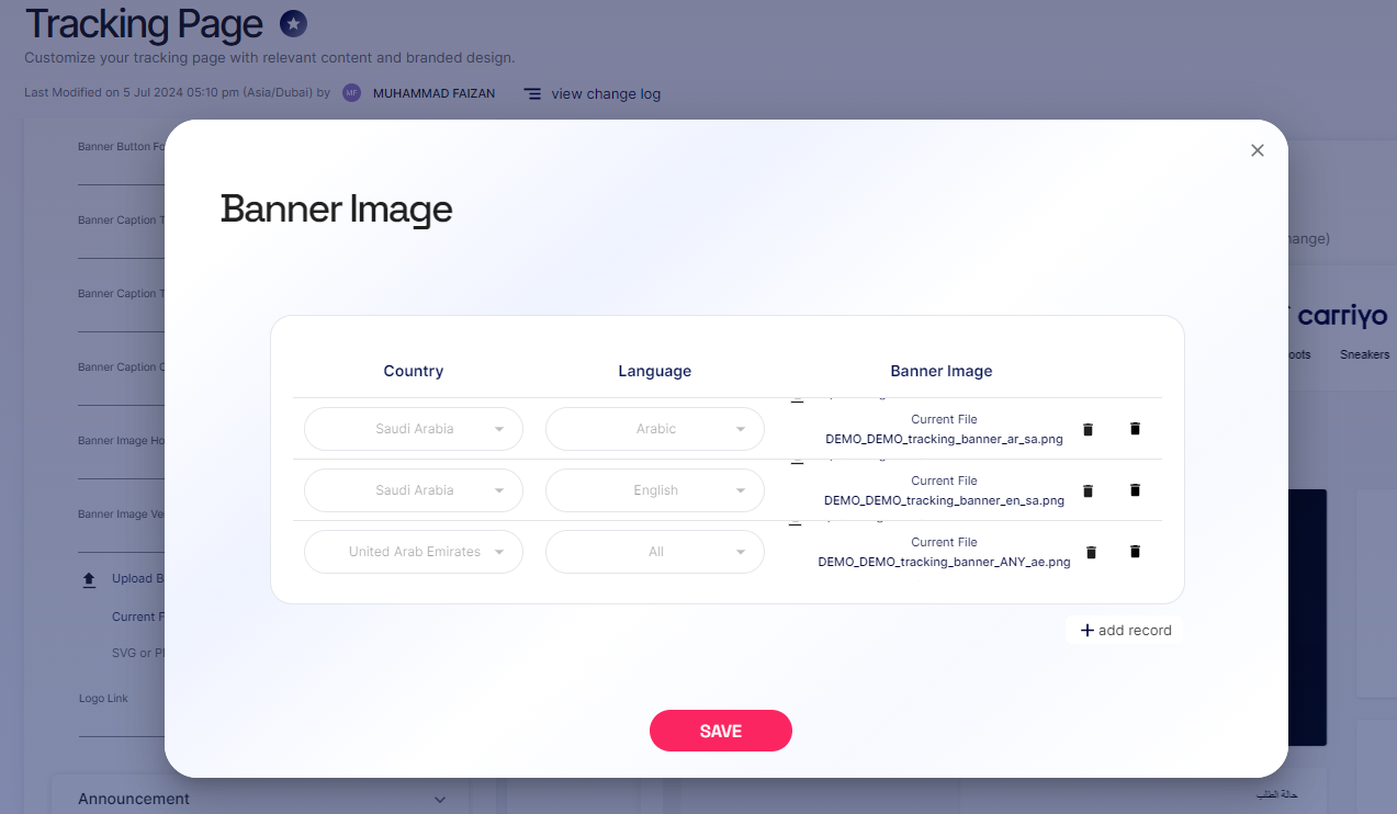 To customize banners for different countries and languages, go to CX Apps > Tracking page, scroll down to the Banner section, and upload pictures specific to each country and language preference.