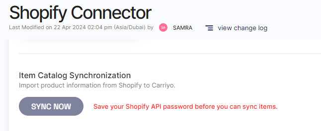 Once configured, navigate to the Shopify Connector page in Carriyo. Scroll down to find the newly added toggle switch "Item Catalog Synchronization". Simply click on the "Sync Now" button. This action will seamlessly synchronize all products from Shopify into Carriyo.