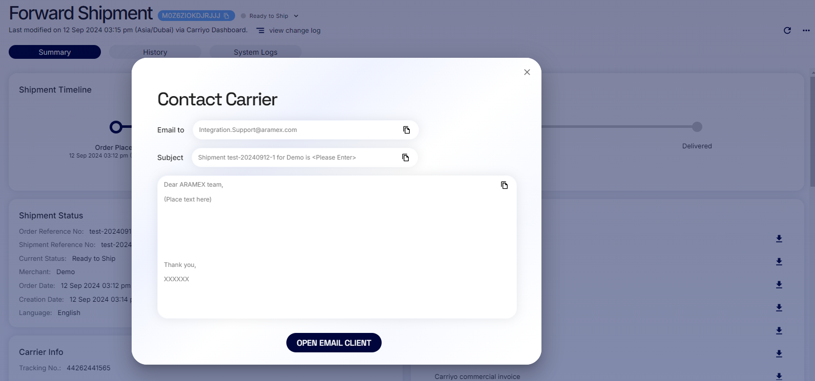 Now, clicking "Contact Carrier" opens a pop-up with an email template, subject line, and contact details, which you can easily copy and use with your preferred email software.
