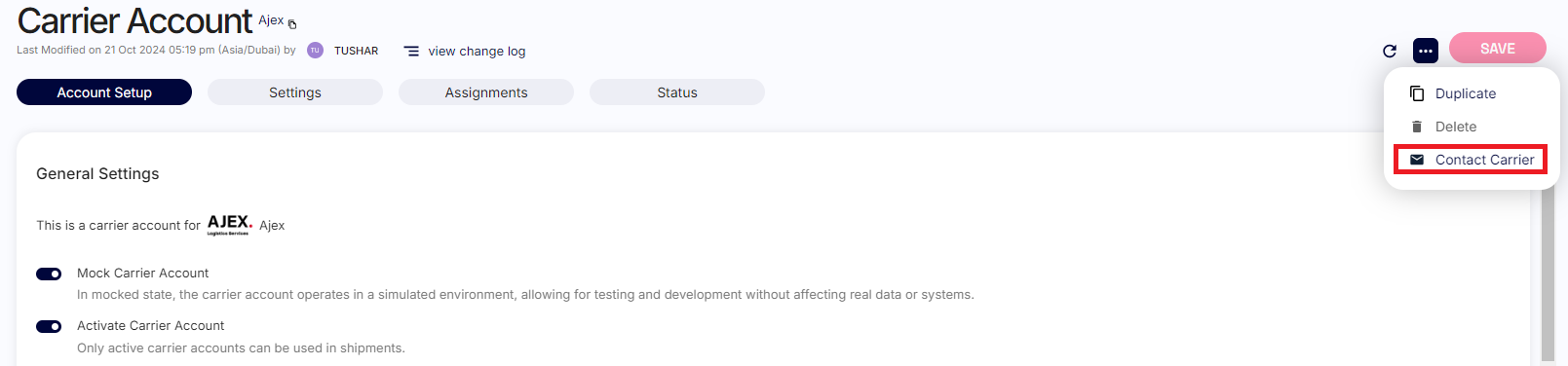 and the carrier account page: