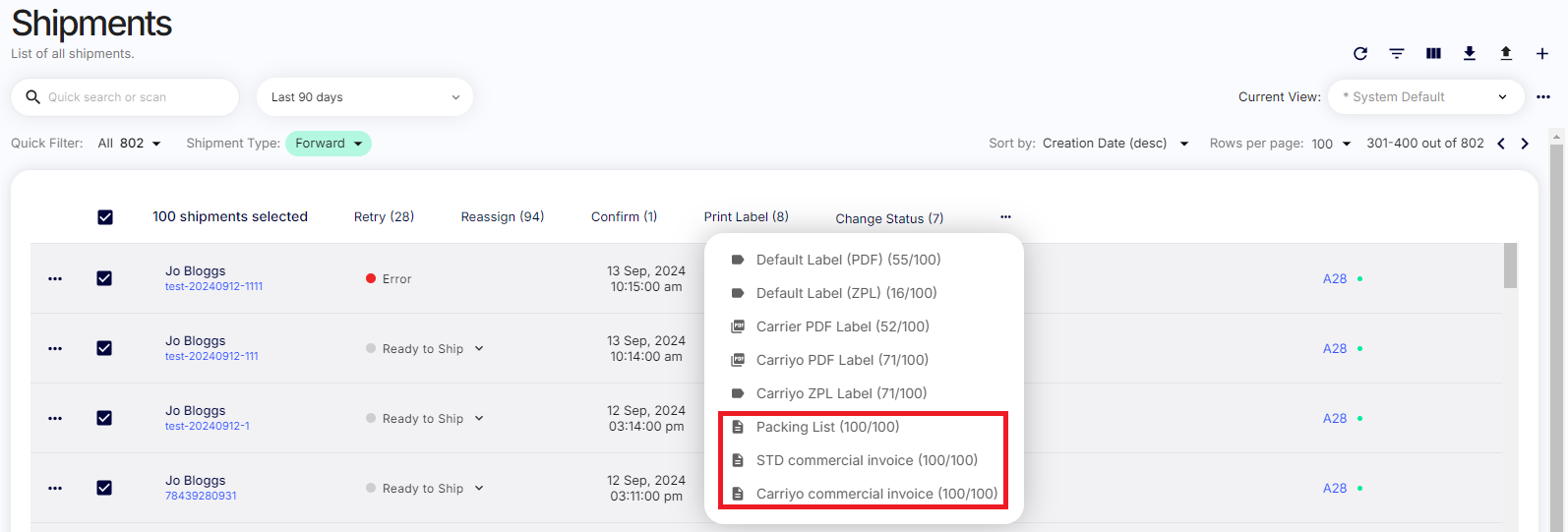 Previously, on the shipments screen, bulk printing was limited to labels. We have now extended this feature to include commercial invoices and packing lists.