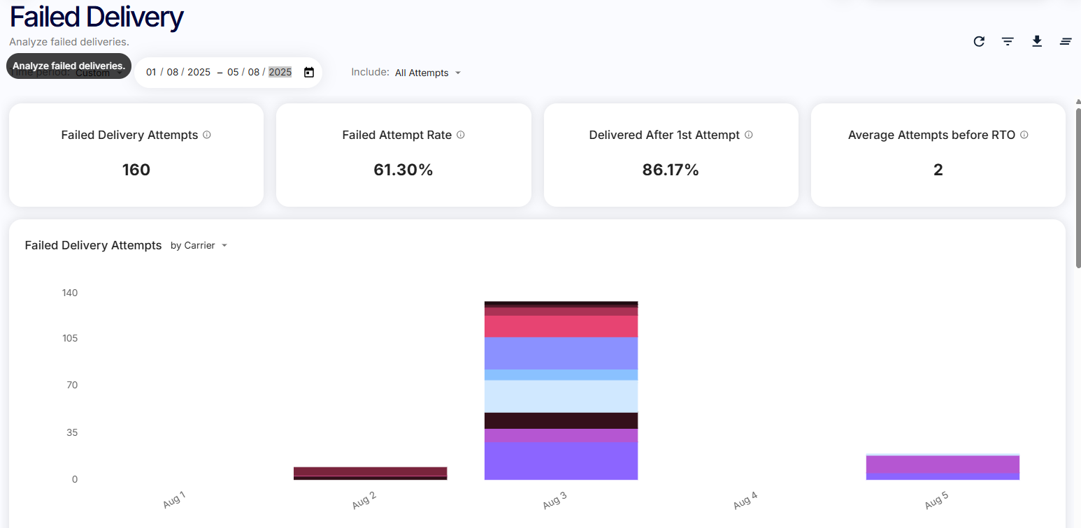 The report provides key insights such as the number of failed attempts and failed attempt rate. It also breaks down failed delivery attempts by carrier, helping you identify trends over a selected period.