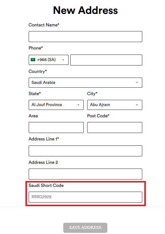 Merchants have to capture the Saudi National Address Short Code in their sales channels (website, apps, etc.) and map it to this field with the type SAUDI_SHORT_CODE.