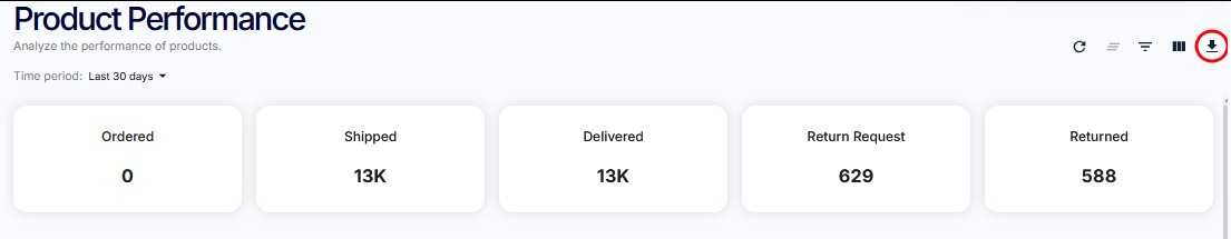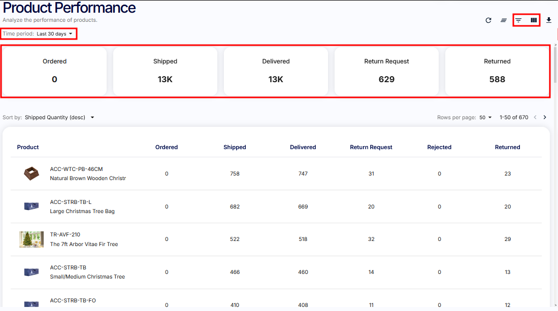 The Product Performance Report is one of the many helpful reports that allows you to analyze shipment-related details. It provides insights into the various products that have been part of a shipment, order, or return request. The report provides quantitative information regarding items shipped, delivered, return requests, and completed returns.