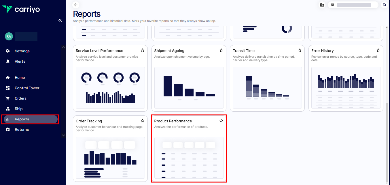 To access the report, navigate to Reports > Product Performance on the Carriyo Dashboard. You can click on the star icon to favorite a report. All starred reports will appear first in the grid list.